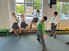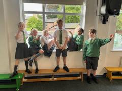 Year 5 pupils posing for a press photo as the children of Charlie and the Chocolate Factory about to enter the factory. Can you guess who is who?